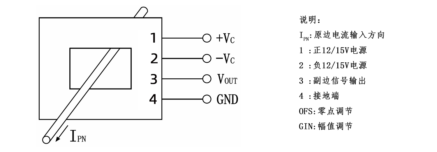 该传感器采用直测式霍尔检测原理工作。原边电流产生的磁通量聚集在磁电路中,并由霍尔器件检测出霍尔电压信号,经过放大器放大,该电压信号精准的反应原边电流。